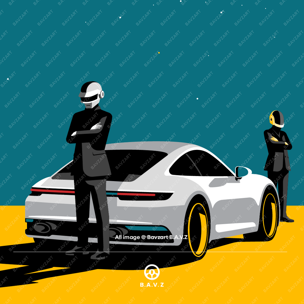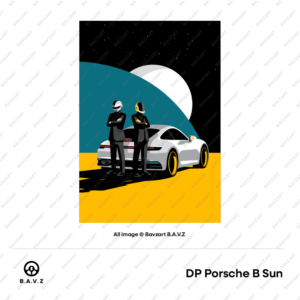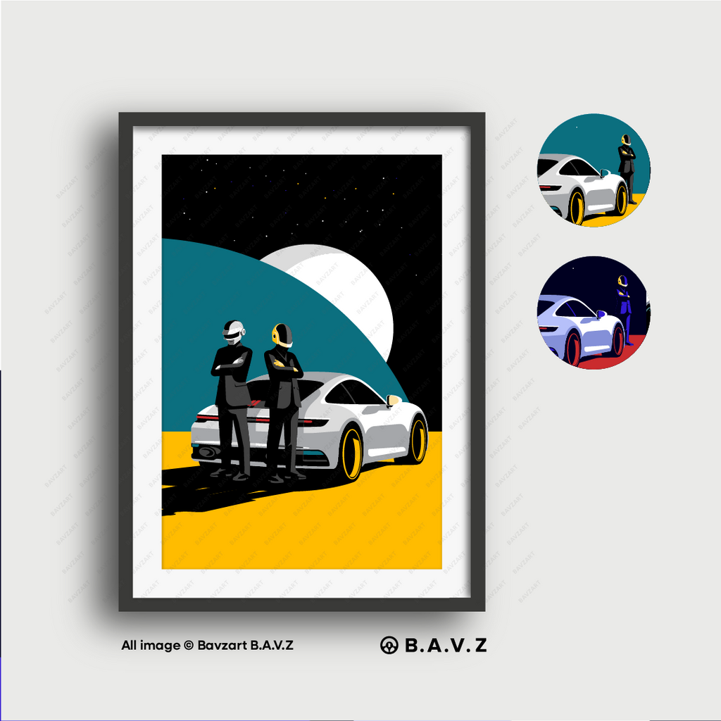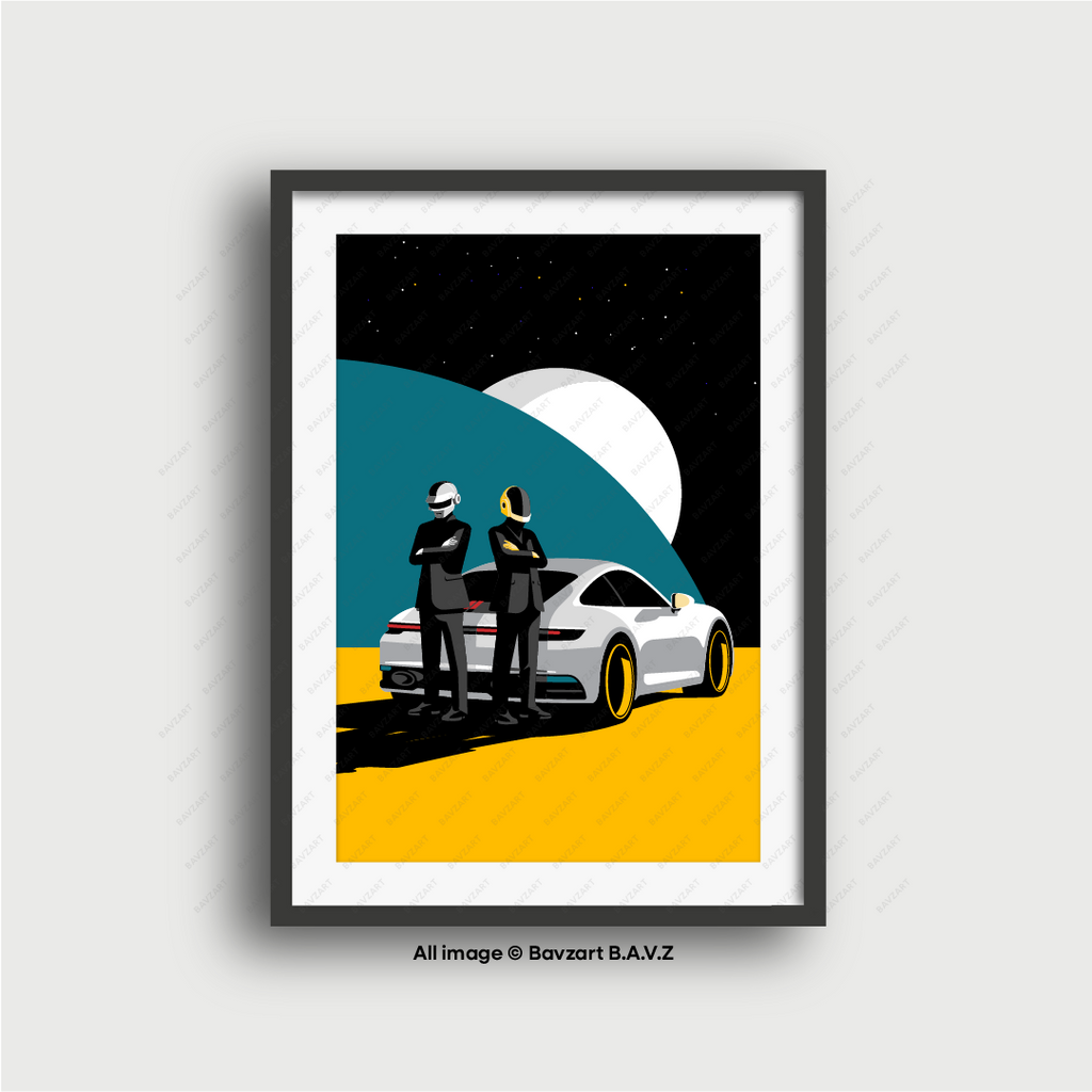 Step into a world where style meets the stars. Daft Punk Drive the Future captures the sleek confidence of a futuristic duo, suited in black and armoured in chrome, standing tall beside a Porsche 992 under a galactic skyline. With bold colours, sharp silhouettes, and a cinematic composition, this piece fuses retro sci-fi flair with luxury street culture.
