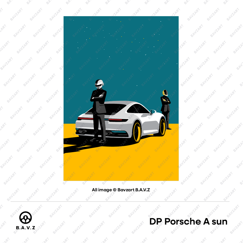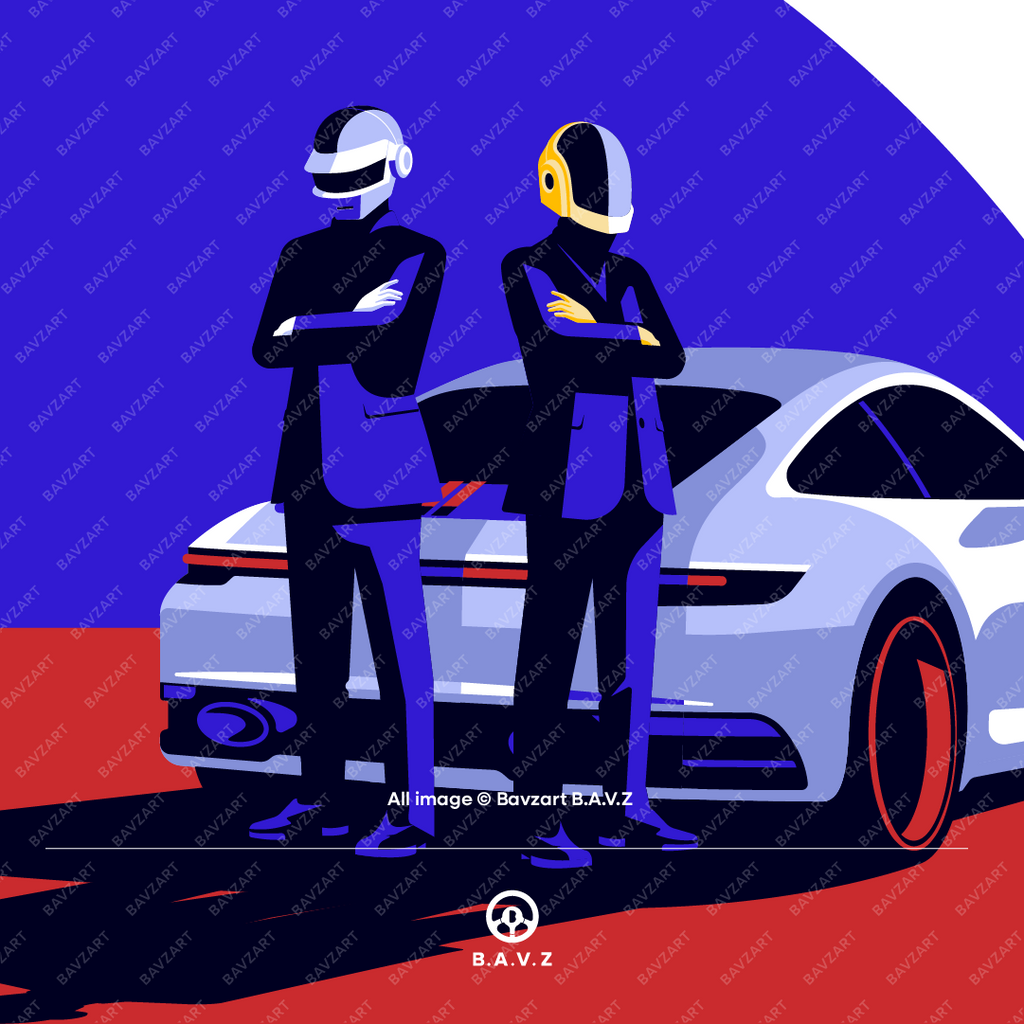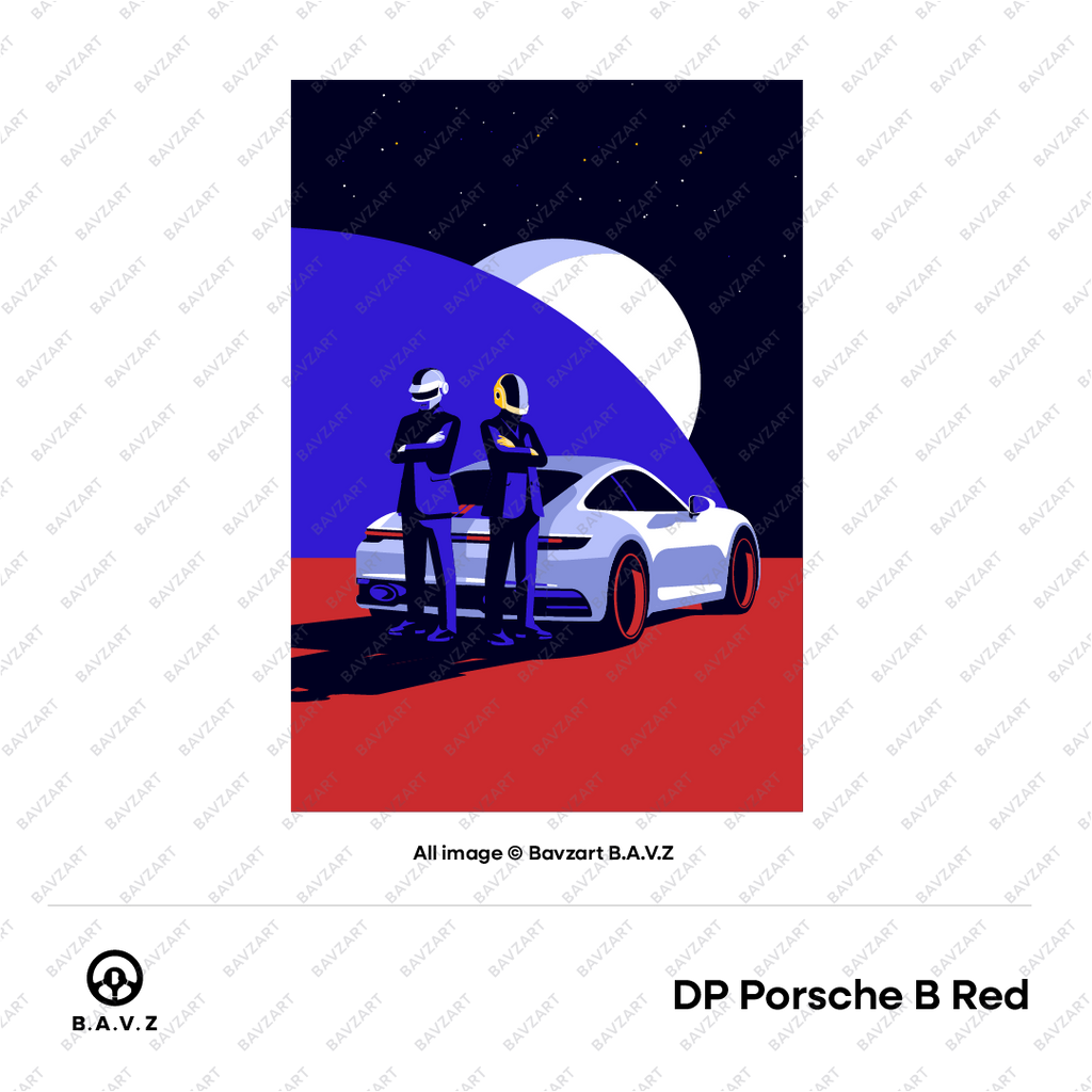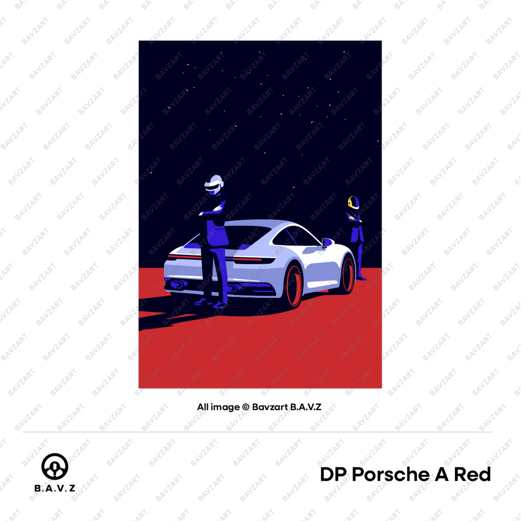Step into a world where style meets the stars. Daft Punk Drive the Future captures the sleek confidence of a futuristic duo, suited in black and armoured in chrome, standing tall beside a Porsche 992 under a galactic skyline. With bold colours, sharp silhouettes, and a cinematic composition, this piece fuses retro sci-fi flair with luxury street culture.