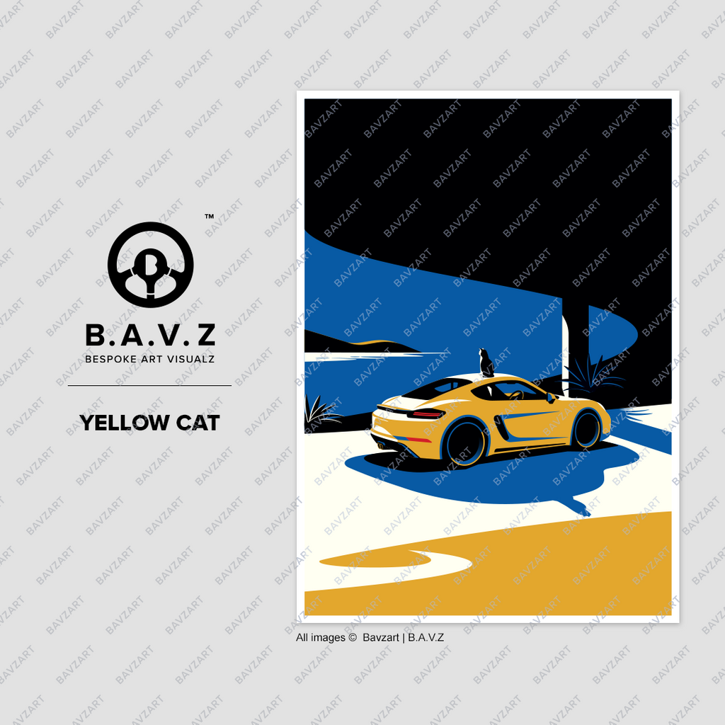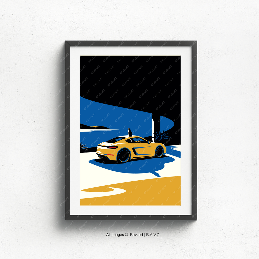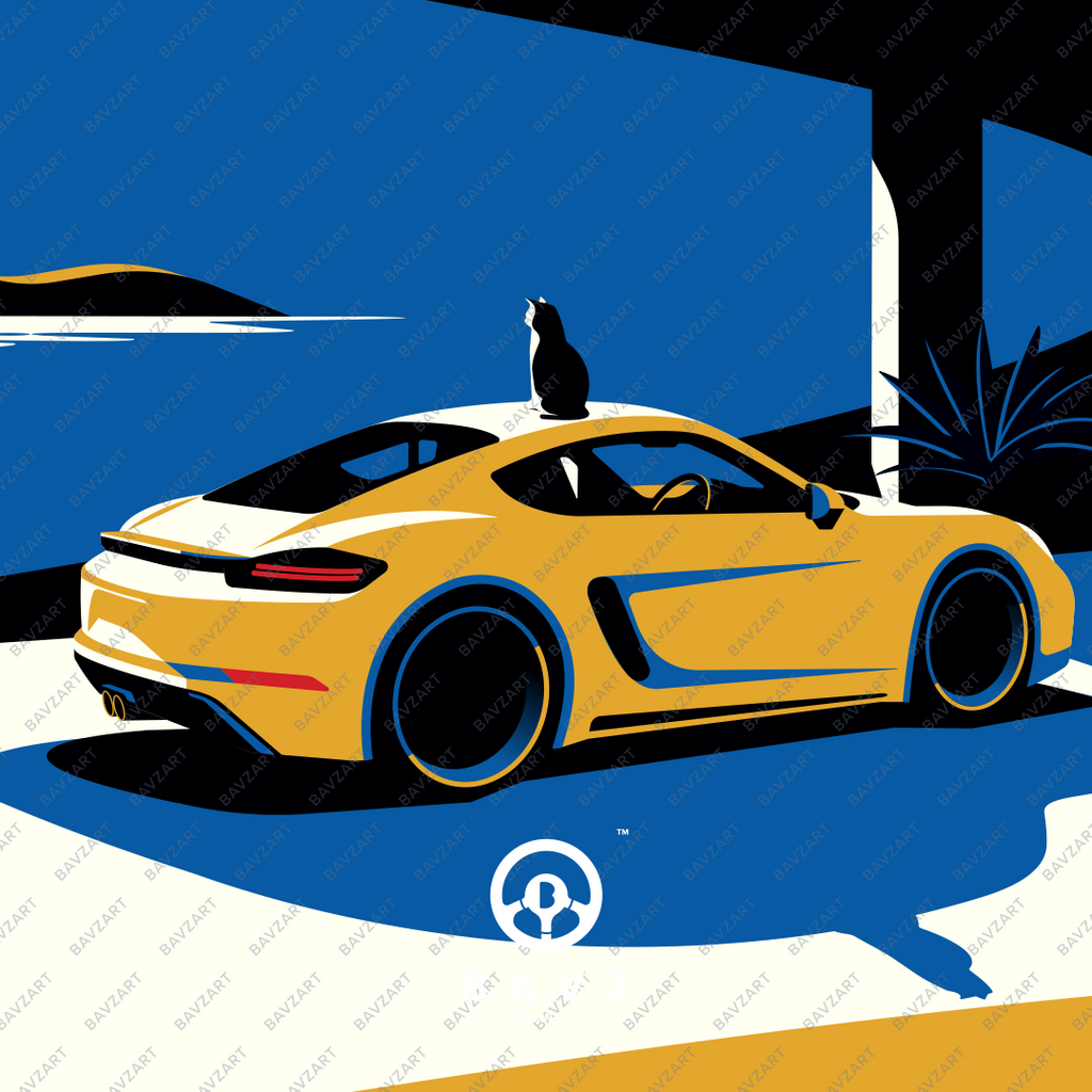 Cat perched on top of the 718 Porsche Cayman, staring off into the distance, mesmerized by the sound of the machinery's soft hum. Situated among the bustling skyline, this majestic piece of art surely has a tale to tell.