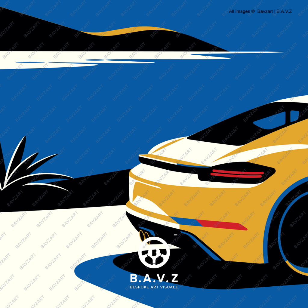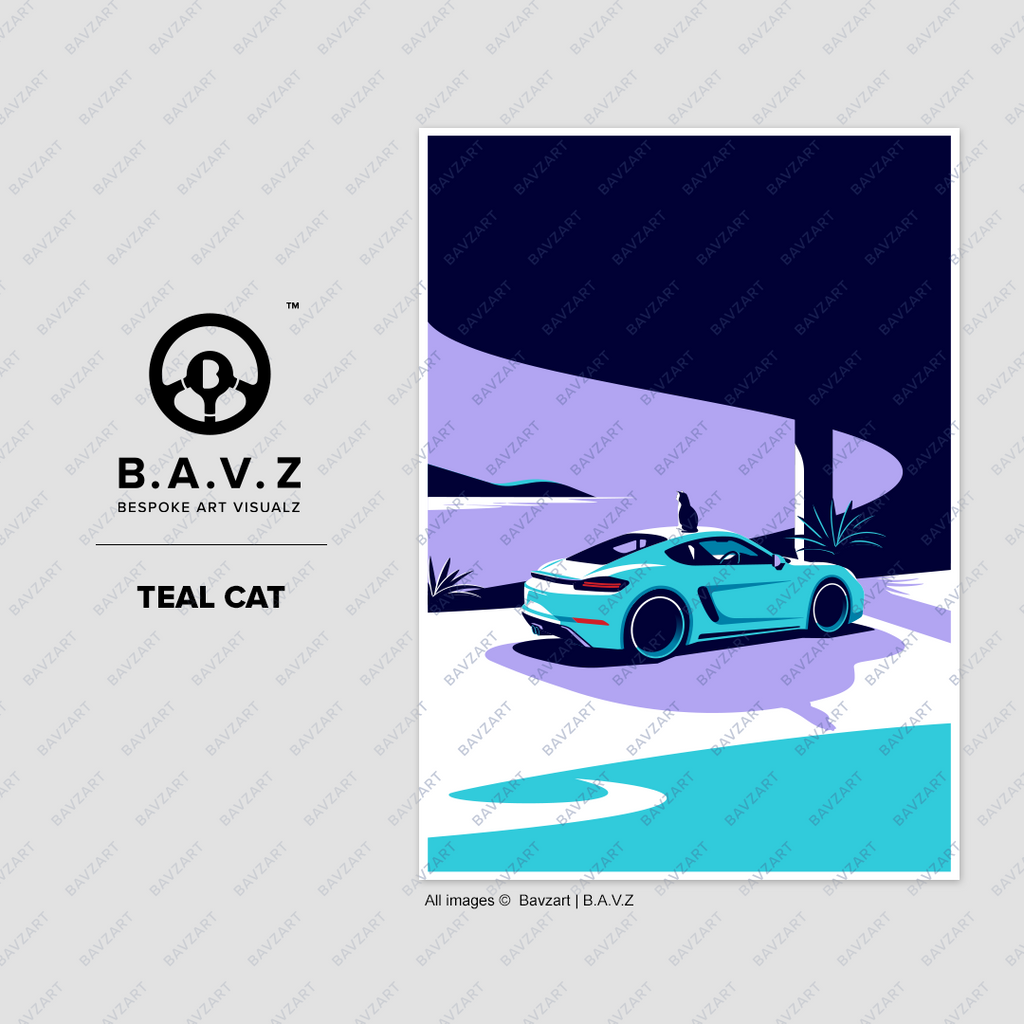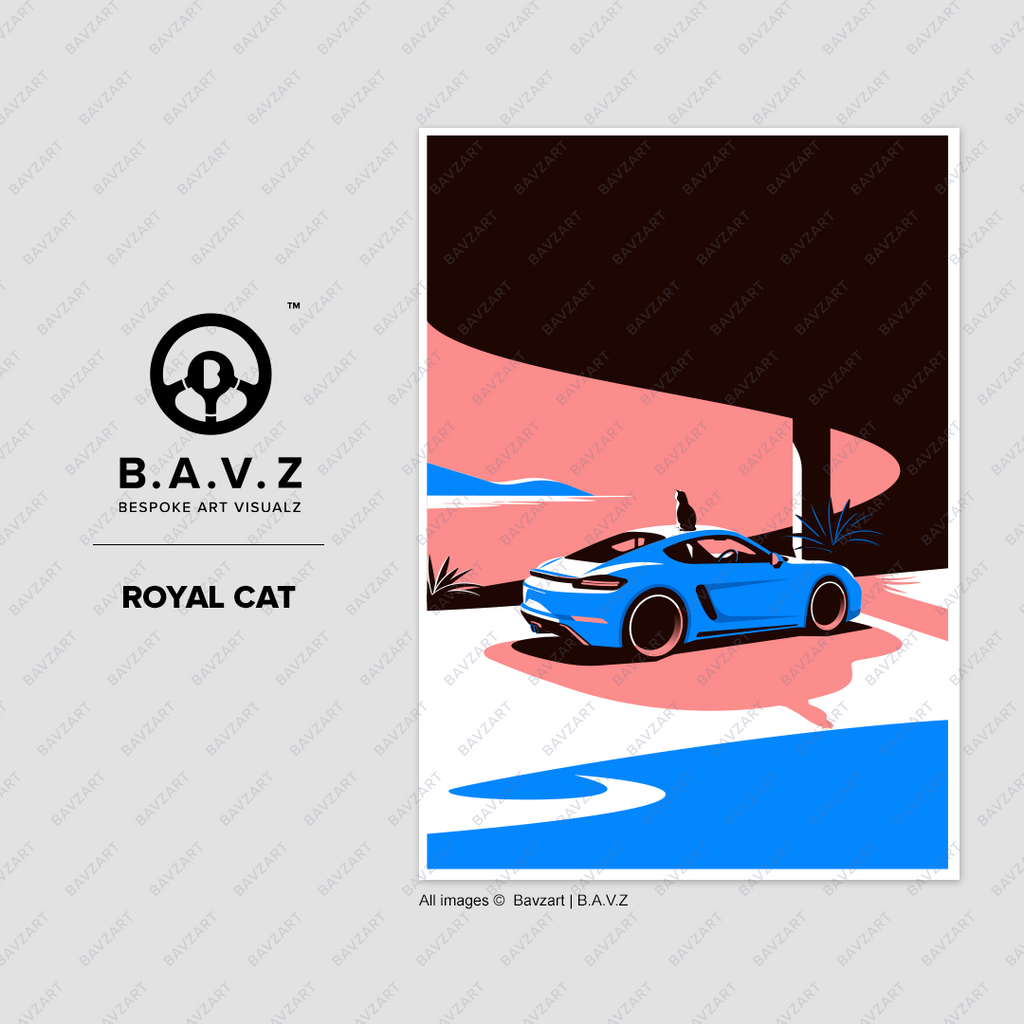 Cat perched on top of the 718 Porsche Cayman, staring off into the distance, mesmerized by the sound of the machinery's soft hum. Situated among the bustling skyline, this majestic piece of art surely has a tale to tell.