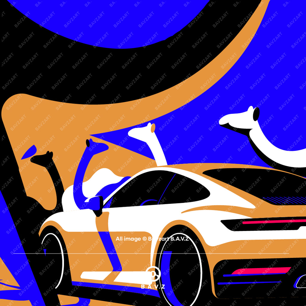 A limited edition art series that transports you to the mesmerizing expanse of the desert, where the Porsche 992 Carrera reigns supreme amidst the grace of majestic camels. This exclusive artwork captures the fusion of high-speed luxury and the timeless allure of the desert landscape.
