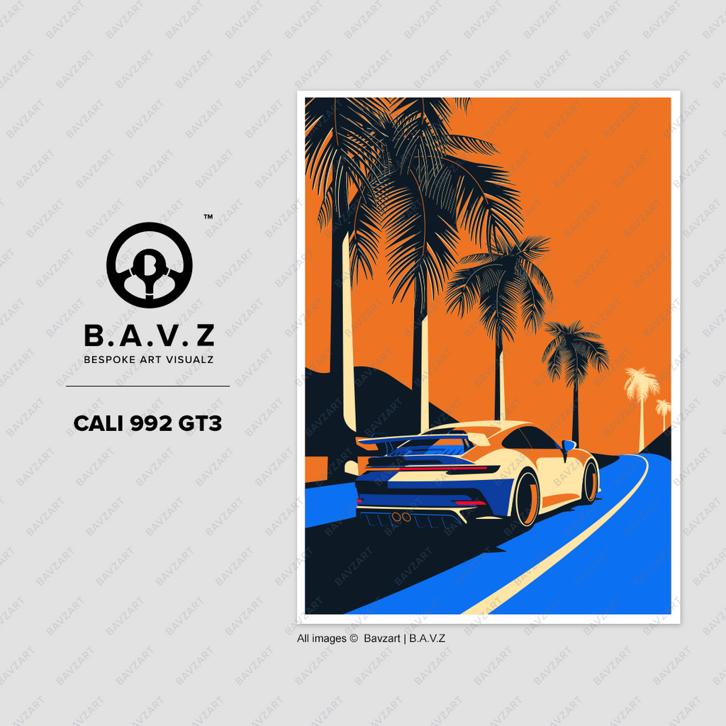 Speeding Through Paradise, a stunning piece that captures the essence of freedom and performance. This artwork features the iconic 992 GT3, a symbol of precision engineering and raw power, as it speeds past towering palm trees under a vibrant sky. The dynamic composition and vivid colors evoke a sense of motion and adventure, making you feel the rush of the open road. Perfect for automotive enthusiasts and art collectors alike, this piece brings the thrill of high-speed travel and the serene beauty of tropical landscapes into your space. Elevate your decor with this captivating blend of luxury and nature.
