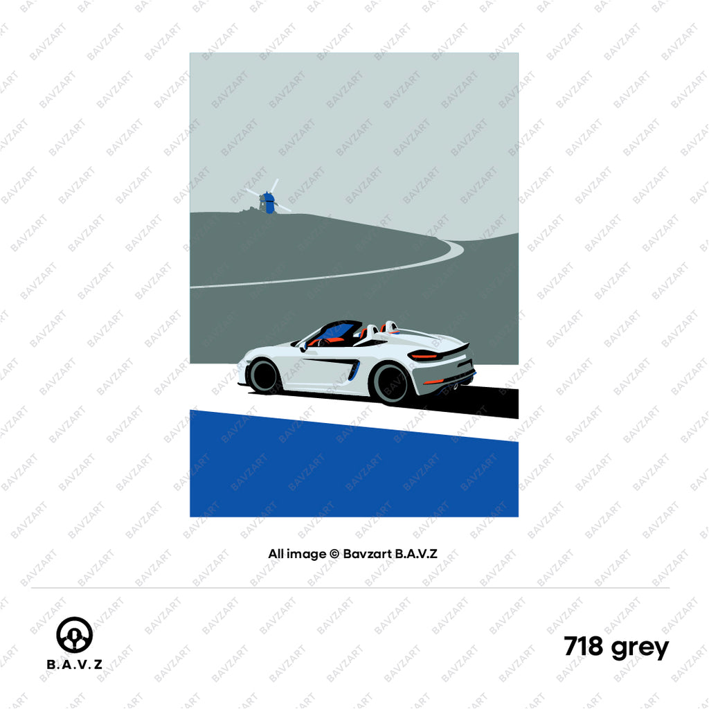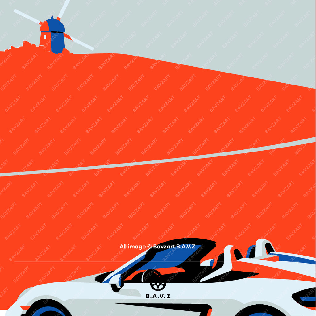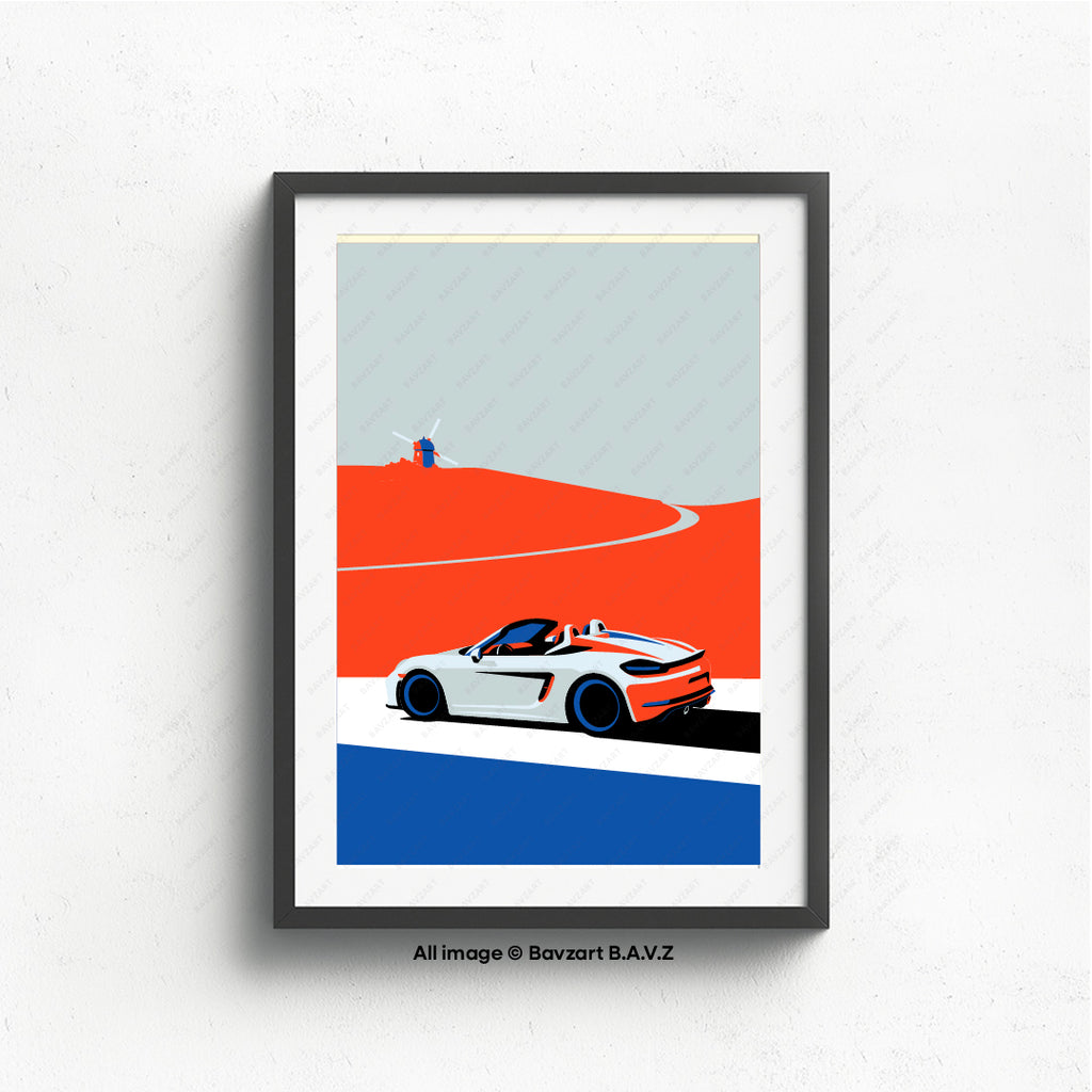 As the Porsche 718 zips past the windmill, there's a sense of movement frozen in time, a thrilling encounter between speed and stillness. This artwork captures the essence of automotive excellence against the backdrop of nature's beauty, inviting viewers to appreciate the artistry by B.A.V.Z in both man-made and natural wonders