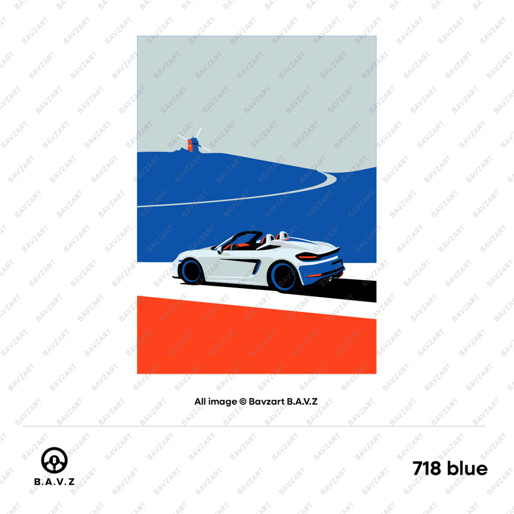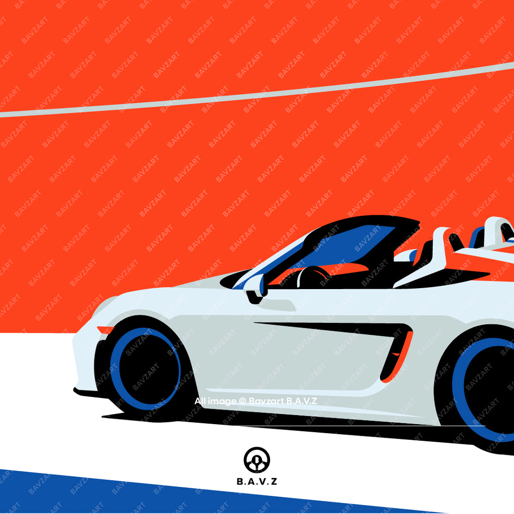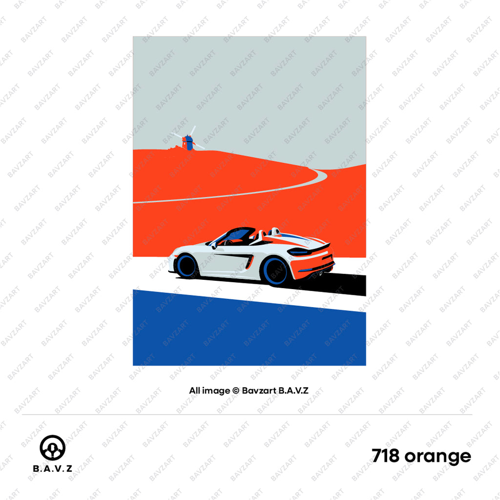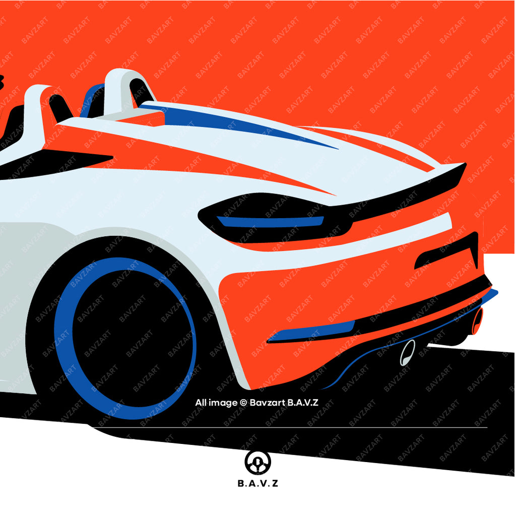 As the Porsche 718 zips past the windmill, there's a sense of movement frozen in time, a thrilling encounter between speed and stillness. This artwork captures the essence of automotive excellence against the backdrop of nature's beauty, inviting viewers to appreciate the artistry by B.A.V.Z in both man-made and natural wonders